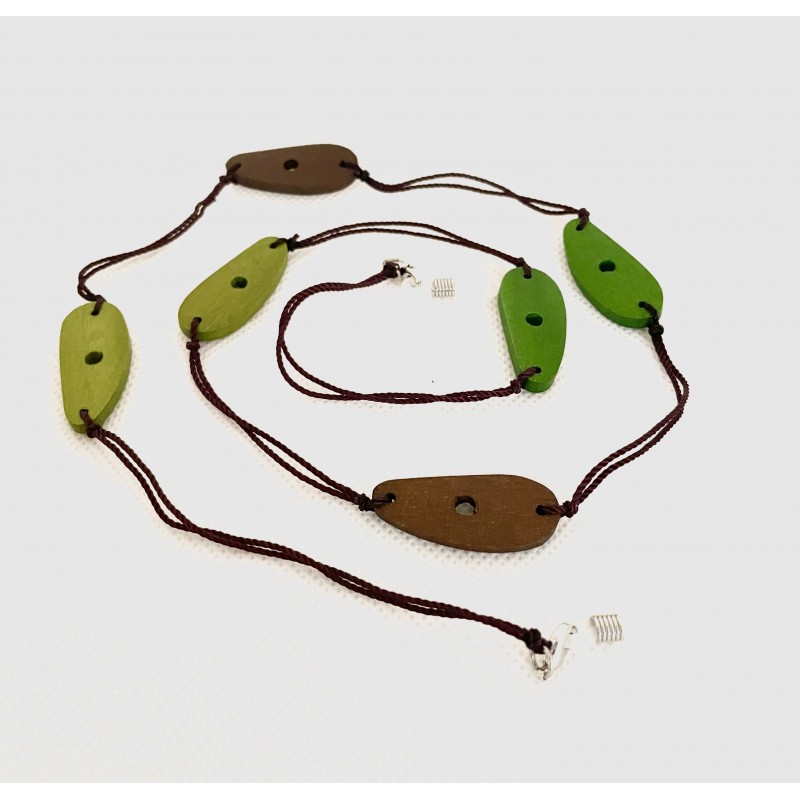Catenella da cordino nero e inserti in legno, munita di bustina in microfibra dalla fantasia a riprendere. Occhielli in silicone per l’alloggiamento degli occhiali che possono essere rimossi per utilizzare la catenella come un vero e proprio ciondolo.